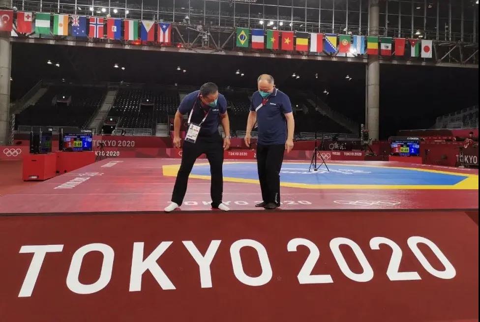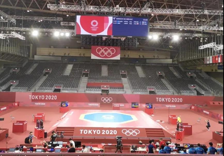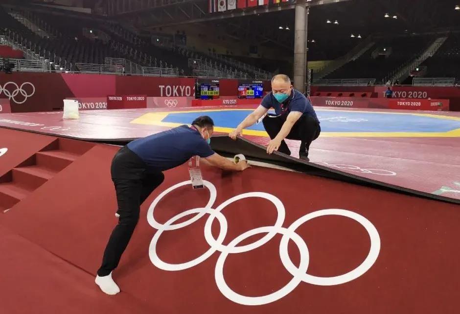 2021年7月20日,日本武道馆——奥运会柔道比赛场地。leyu乐鱼体育体育东京奥运会服务保障团队正在布置、安装柔道器材