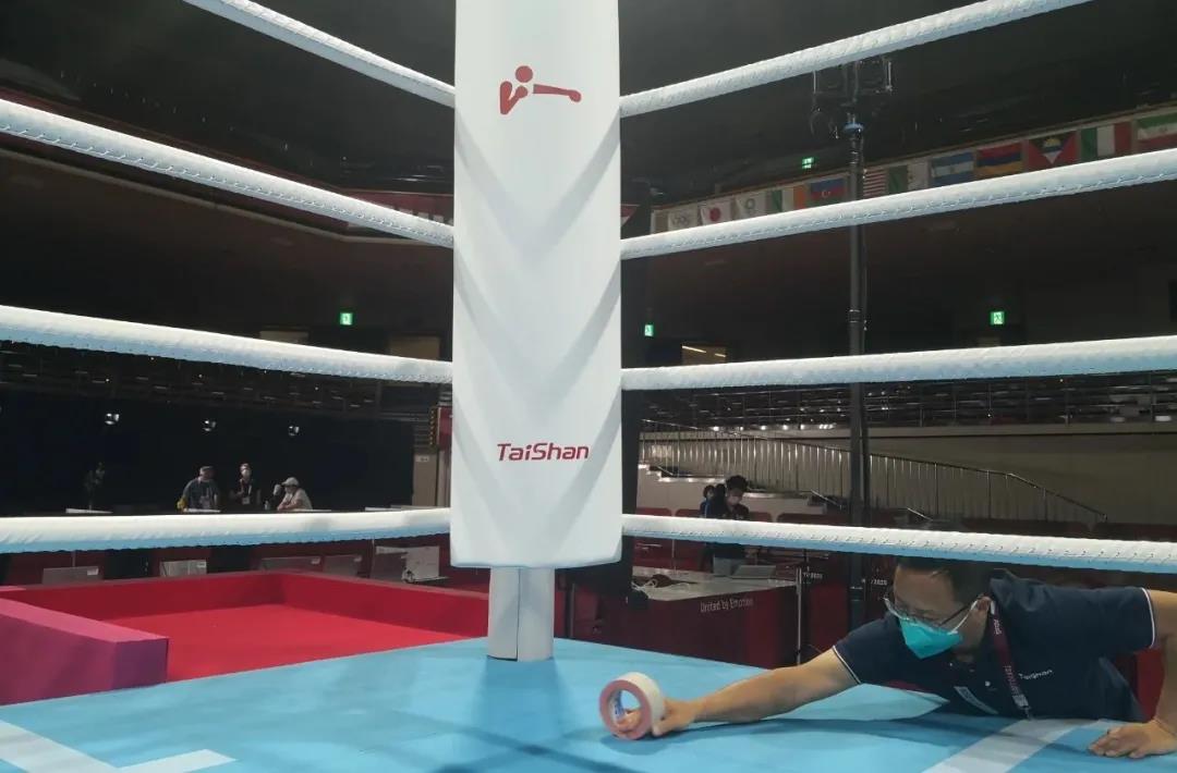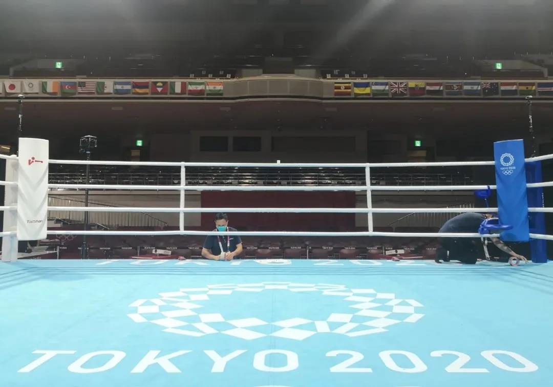 2021年7月21日,日本东京国技馆——奥运会拳击比赛馆。leyu乐鱼体育体育东京奥运会服务保障团队正在检查调试拳击器材。