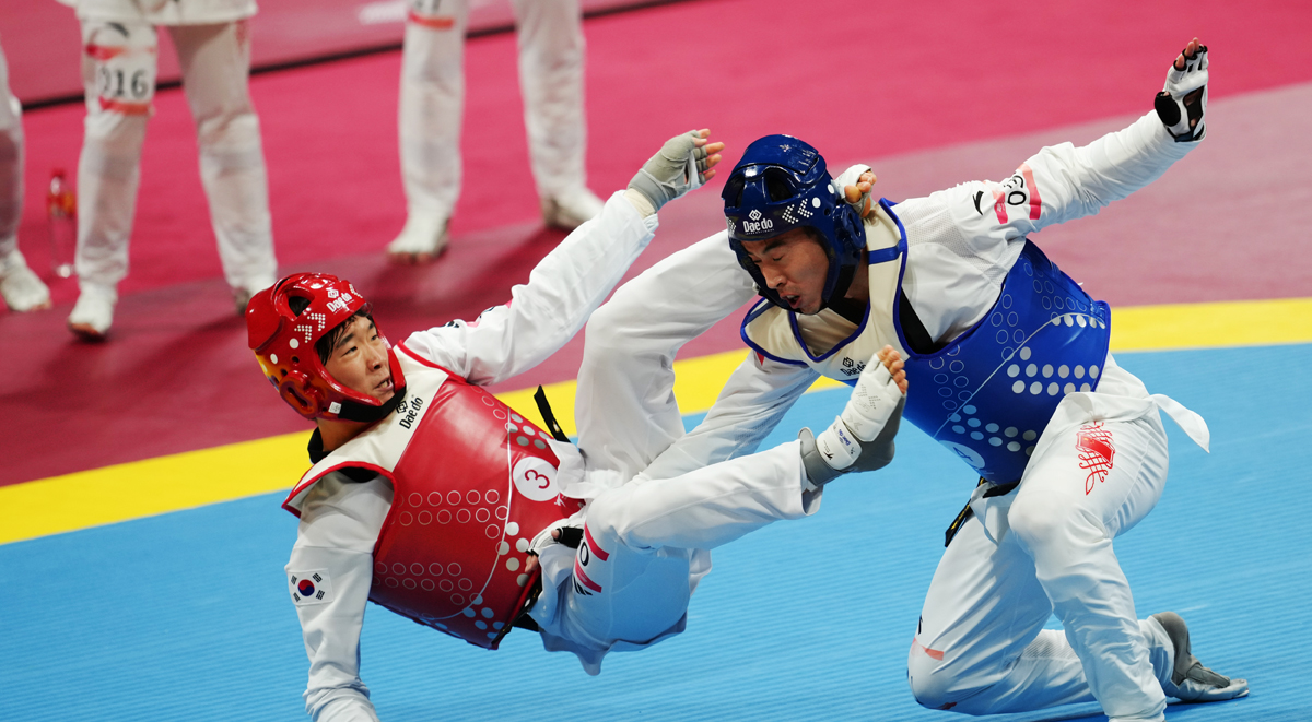 杭州亚运会跆拳道项目比赛25日在杭州临安体育文化会展中心体育馆决出三枚金牌,东道主中国队获得1金1银1铜,韩国、泰国各摘得1金。竞技混合团体赛是杭州亚运会竞技跆拳道新增项目。决赛中,由崔阳、宋兆祥、宋洁、周泽琪组成的中国队以84比77力克韩国队夺金。这也是中国跆拳道队在本届亚运会获得的首枚金牌。