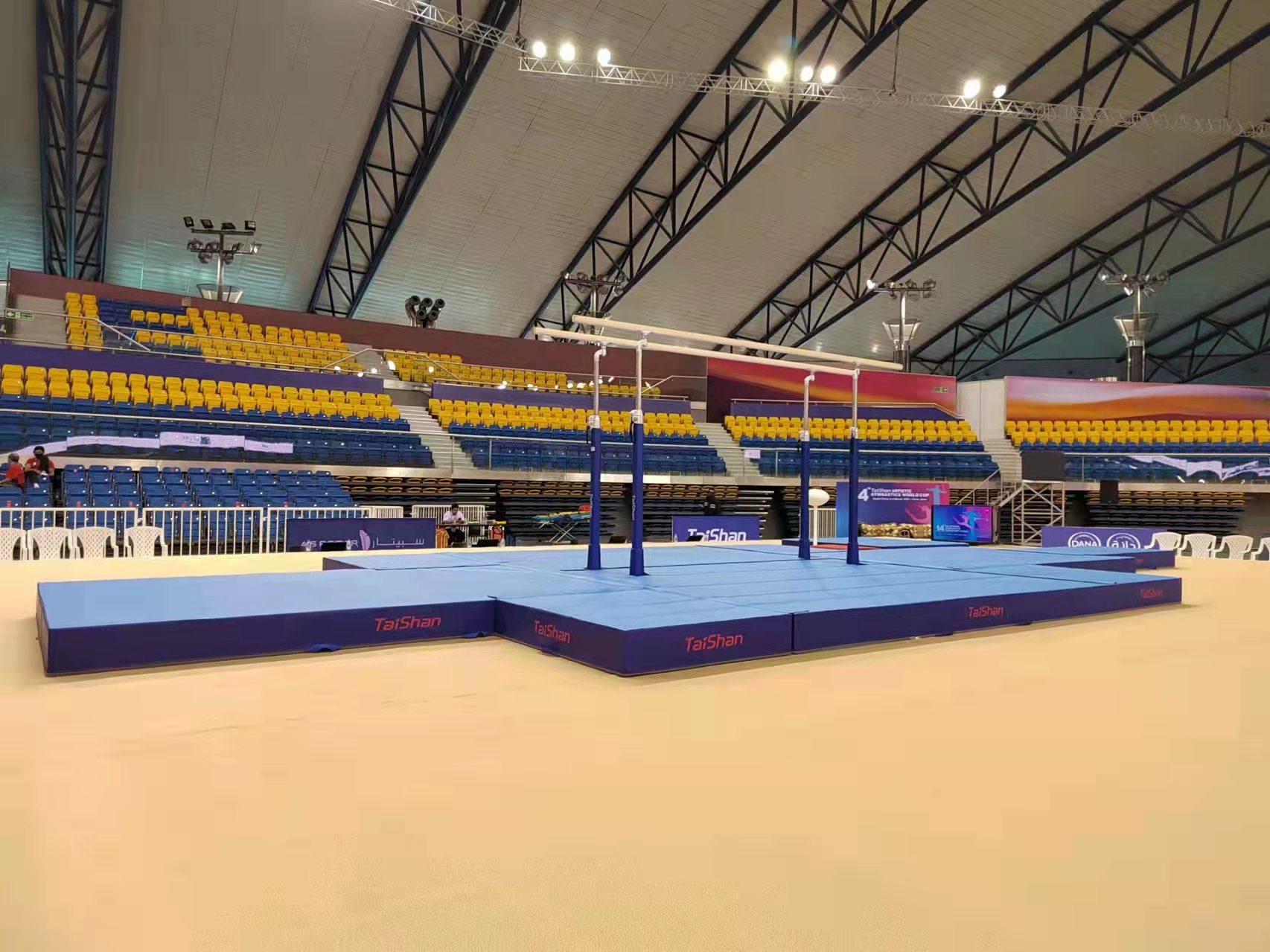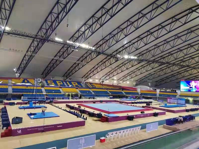 为保障运动健儿的出色发挥,leyu乐鱼体育体育派出了经验丰富的专业服务团队,于2月22日出发,到达多哈后,队员们不辞辛劳,马上投入到技术指导和安装工作中,并按计划于2月28日圆满完成男子训练馆、女子训练馆、竞赛馆等场馆的安装、调试工作。